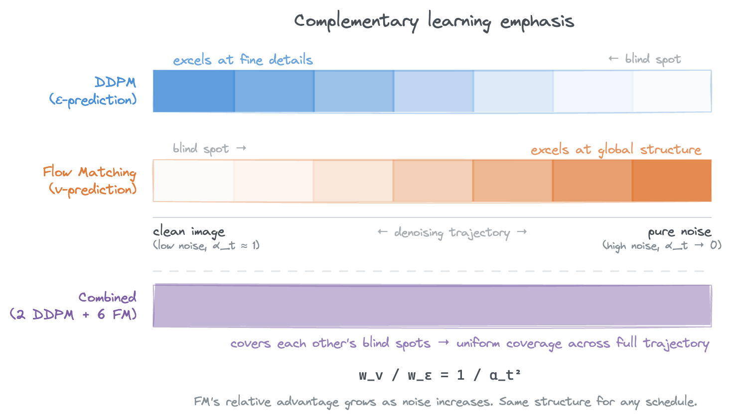 DDPM concentrates learning signal near clean images. Flow Matching emphasizes high-noise timesteps. Their blind spots are complementary.