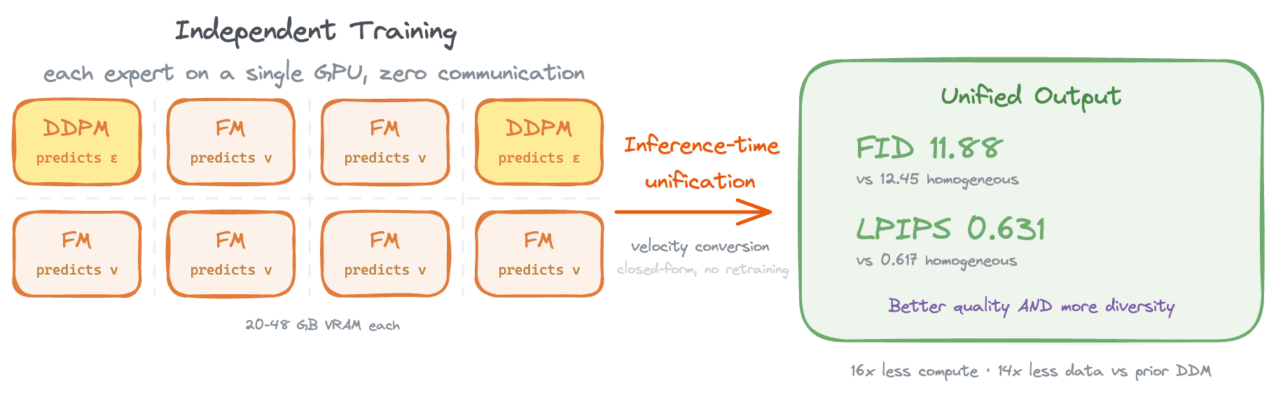 Under aligned inference settings, this heterogeneous ensemble (2 DDPM + 6 FM experts) achieves better FID (11.88 vs. 12.45) and higher intra-prompt diversity (LPIPS 0.631 vs. 0.617) than a homogeneous ensemble of 8 FM experts. Relative to the training scale reported for prior DDM work, our framework reduces compute from 1176 to 72 A100-days (16×) and data from 158M to 11M images (14×), with each expert requiring only 24–48 GB VRAM on a single GPU, making decentralized diffusion training accessible on commodity hardware.