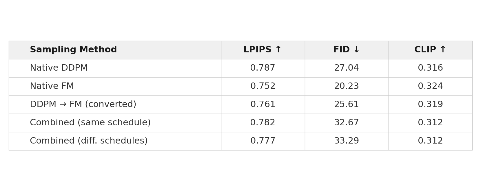 Three findings emerge. First, the conversion works. DDPM → FM improves over native DDPM (FID 25.61 vs. 27.04) while preserving semantic coherence (CLIP 0.319 vs. 0.316). The conversion is most valuable as a compatibility mechanism rather than a lossless objective replacement.