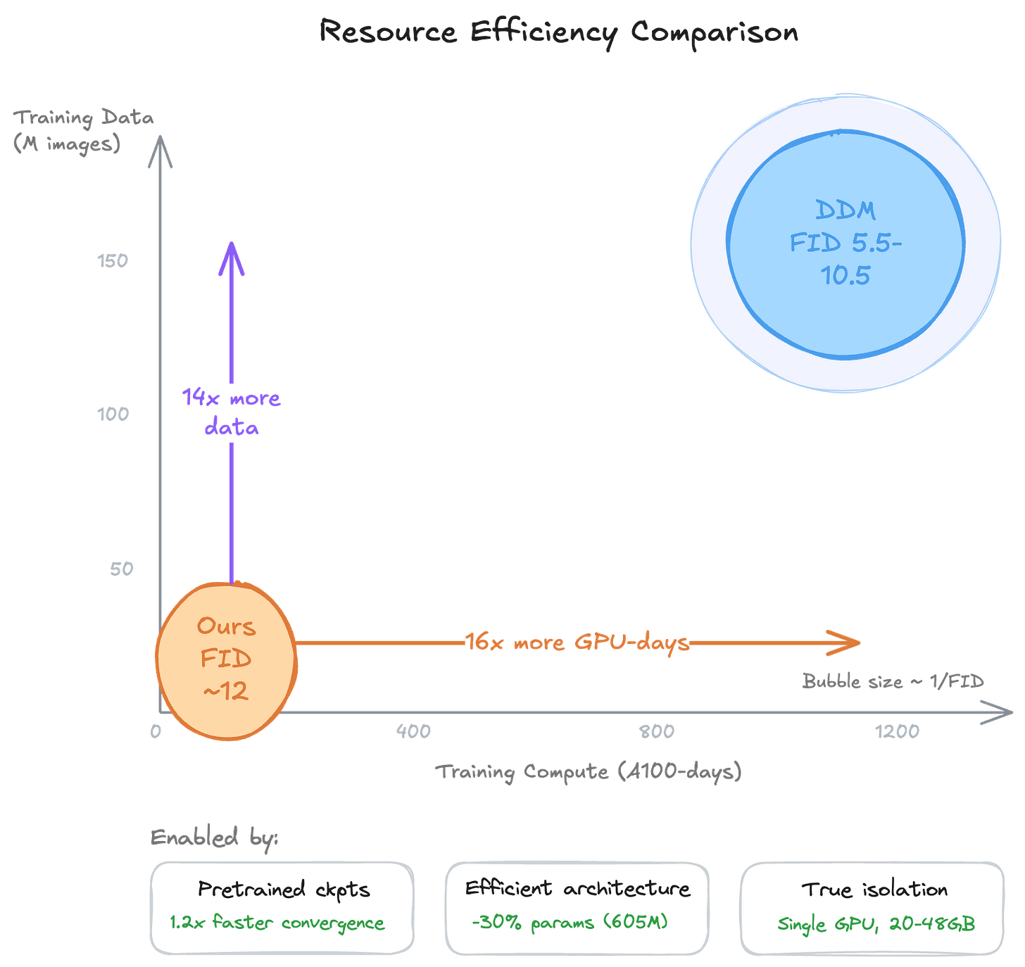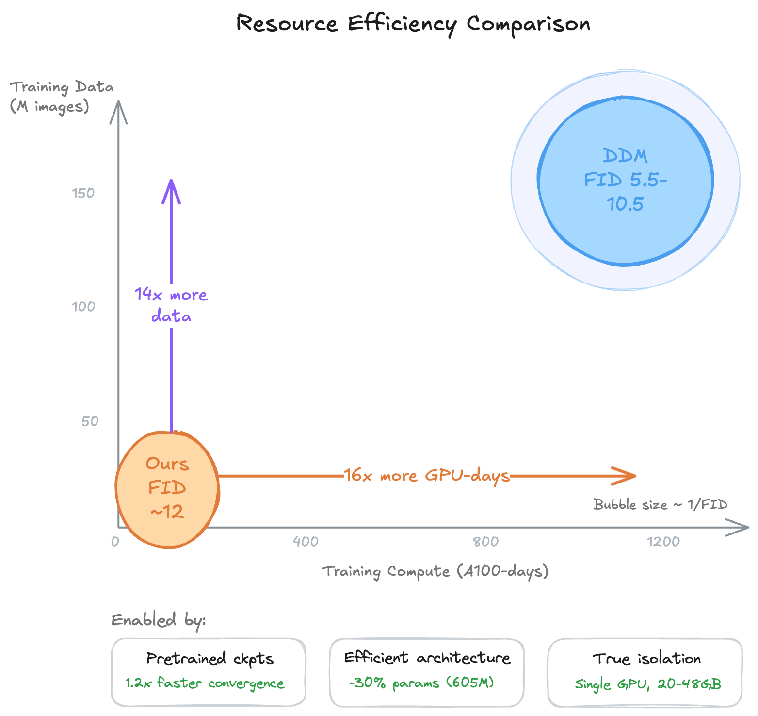 Resource comparison: our approach requires a fraction of the compute and data of prior DDM work.