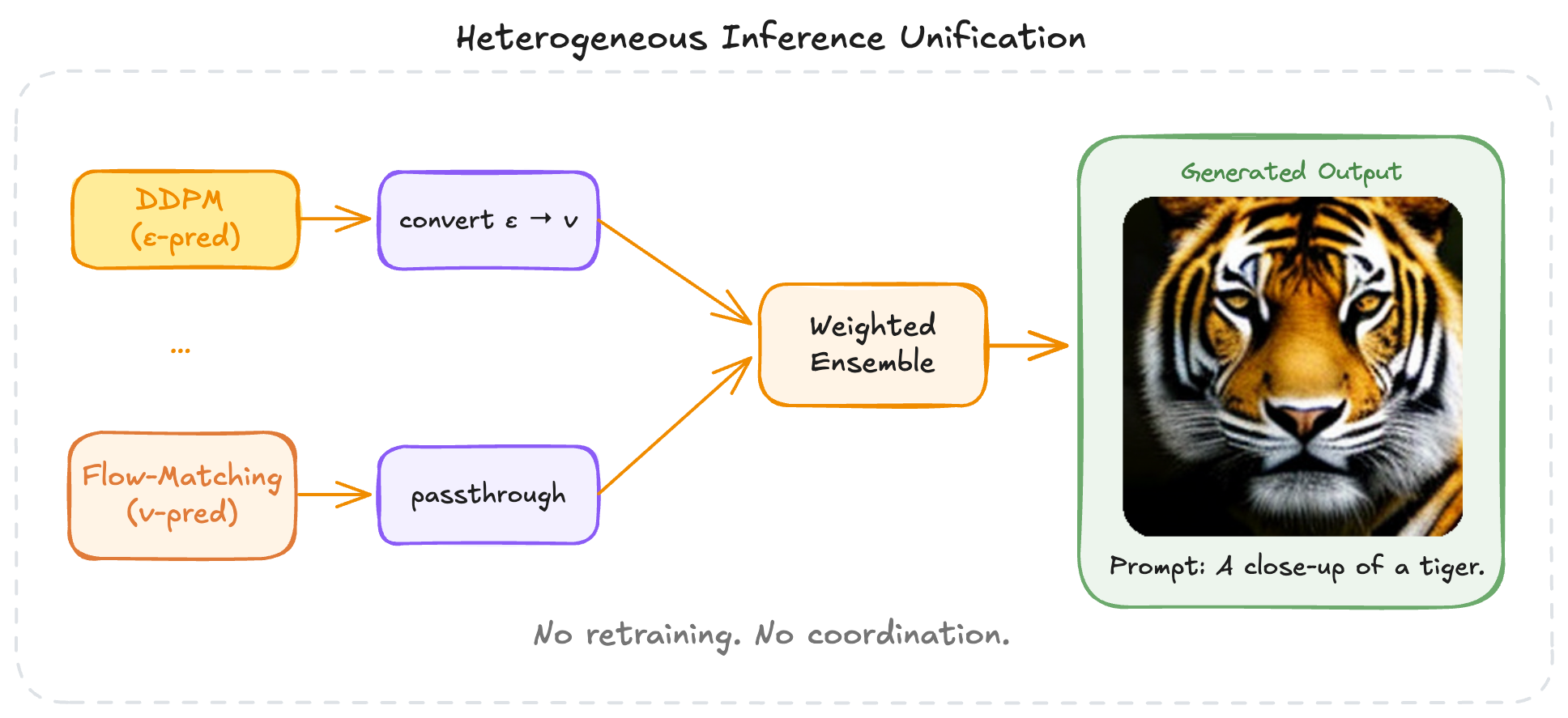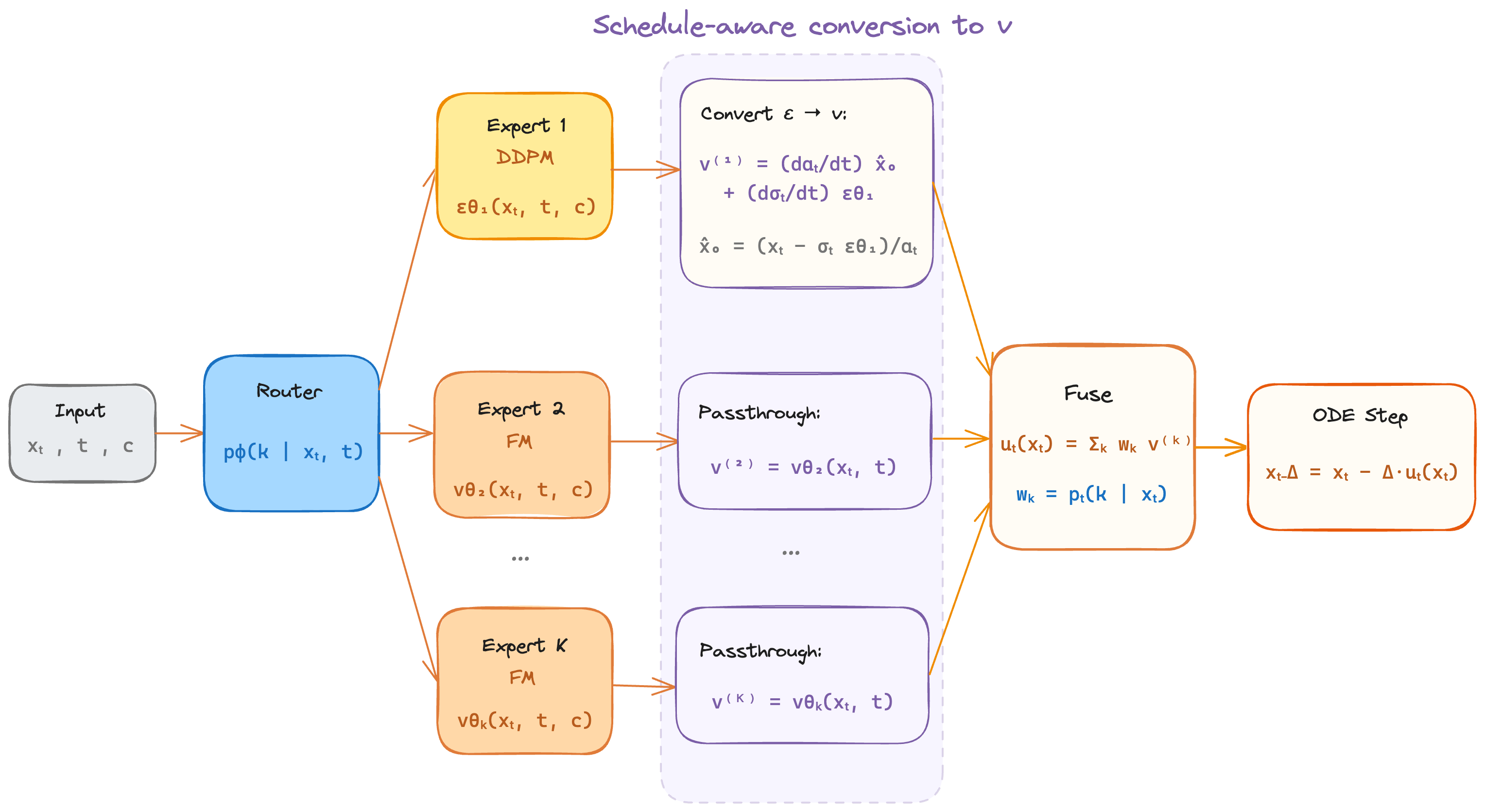 The central technical challenge is that DDPM experts output noise predictions ε_θ(xₜ, t) while FM experts output velocity predictions v_θ(xₜ, t). These live in different spaces. You cannot average them directly.