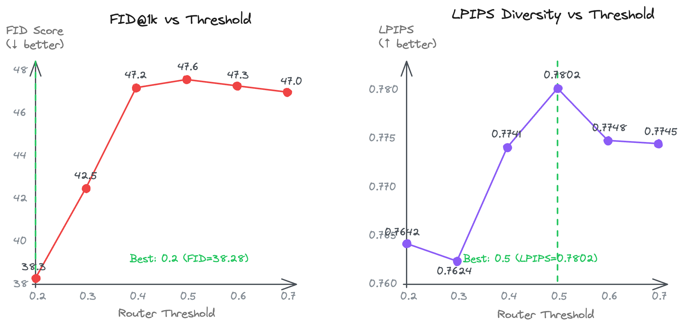 Impact of router threshold on generation quality. Different thresholds produce a clear quality-diversity trade-off.