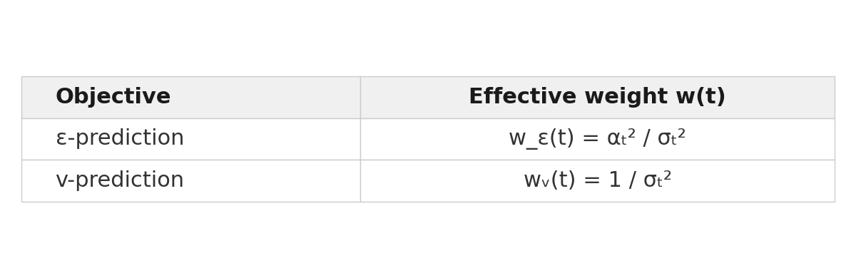 Here w_ε(t) and wᵥ(t) are the effective per-timestep weights after rewriting each loss in terms of clean-sample estimation error. Since αₜ ≤ 1 and decays toward 0 at high noise, this ratio diverges. Velocity-prediction experts receive relatively stronger gradients at high-noise timesteps (global structure), while ε-prediction experts are relatively upweighted at low noise (fine details). In the paper, we derive this under a variance-preserving schedule and then note that linear interpolation recovers the same 1 / αₜ² structure. So the complementary weighting pattern holds both for the VP analysis and for the linear FM path used here.