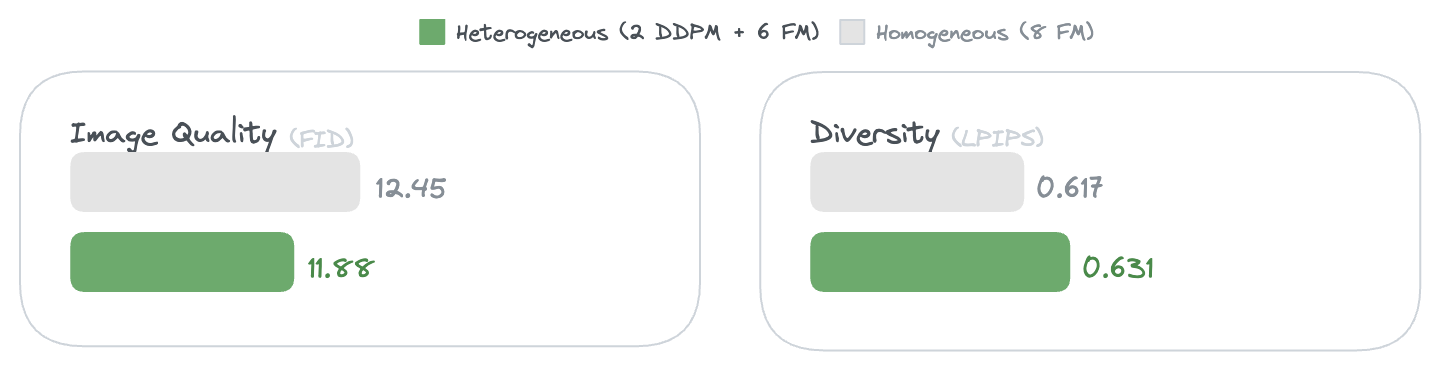 Second, combined experts achieve higher output diversity (LPIPS 0.782) than single FM (0.752), approaching native DDPM levels (0.787). Heterogeneous objectives create complementary generation patterns.