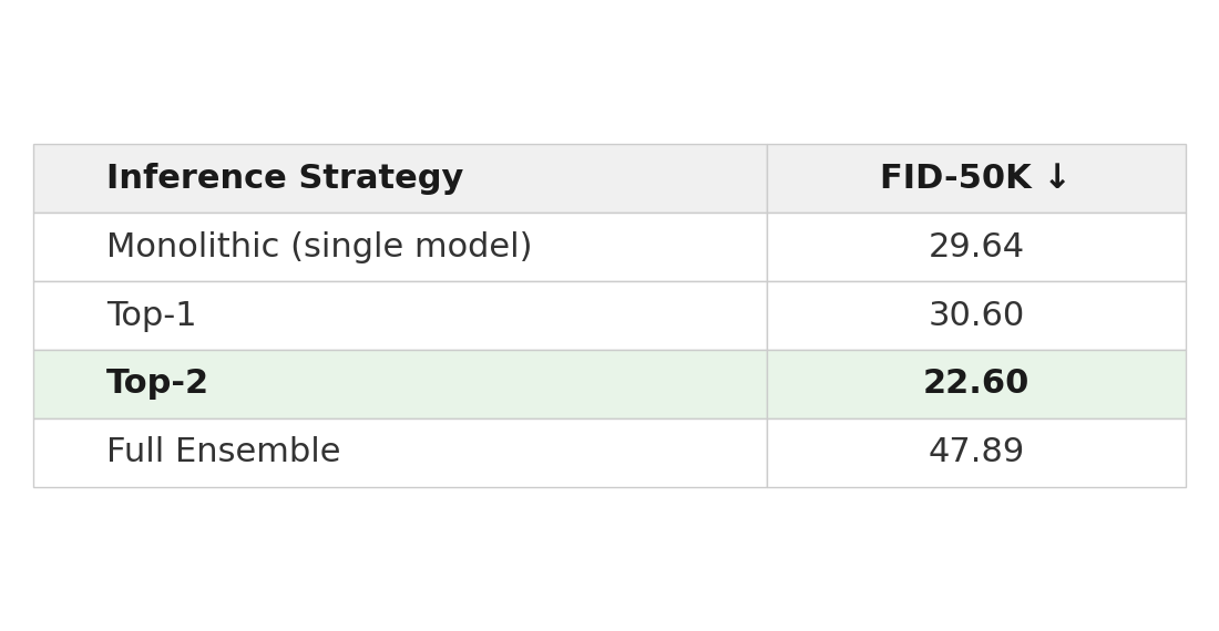 trained with cross-entropy loss against ground-truth cluster labels. At inference, the router dynamically selects and weights experts based on the current noisy state and timestep. We support three selection modes: Top-1 (single best expert), Top-K (weighted ensemble of K highest-probability experts), and Full Ensemble (all experts weighted by router probabilities). As shown in our prior work, Top-2 routing consistently outperforms Full Ensemble because sparse routing maintains expert-data alignment, selecting experts that are in-distribution for the current denoising state.