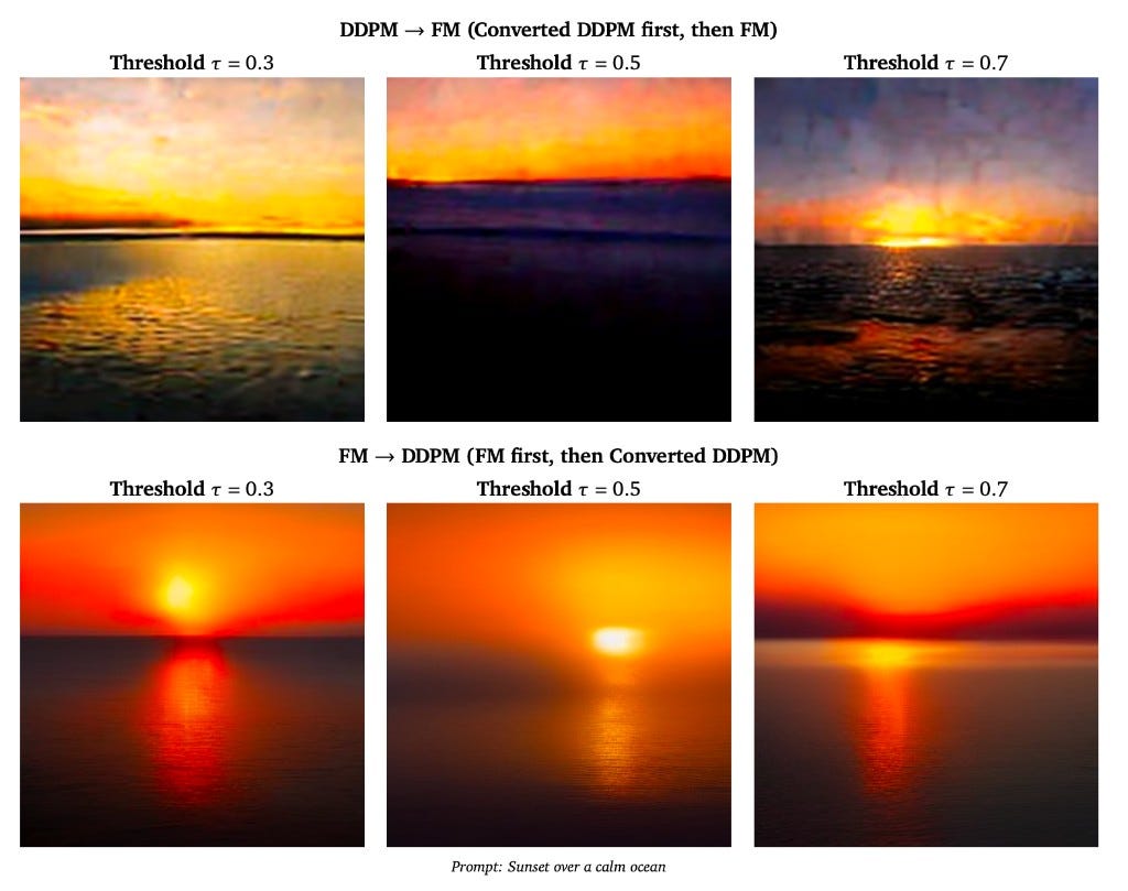 The results reveal a striking asymmetry. FM→DDPM (bottom row) produces consistently cleaner images across all thresholds. DDPM→FM (top row) degrades at higher thresholds, with blocky artifacts and oversaturation. The reason: when DDPM operates first at high noise (αₜ → 0), the conversion x̂₀ = (xₜ - σₜ ε_θ)/αₜ is numerically unstable, and errors early in the trajectory get baked into the image structure. Letting FM handle high-noise timesteps first avoids this entirely — the converted DDPM expert then refines at low noise where conversion is stable.